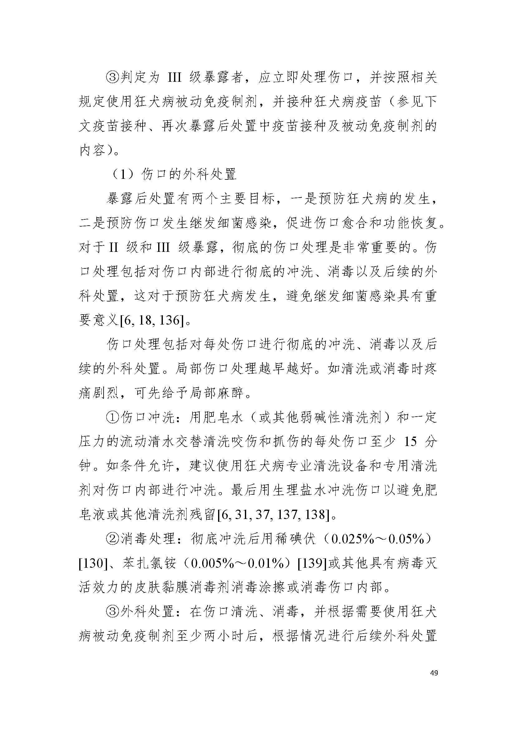 用(yòng)肥皂水(shuǐ)(或其他(tā)弱堿性清洗劑)和(hé)一(yī)定壓力的(de)流動清水(shuǐ)(如(rú)自(zì)來(lái)水(shuǐ)管)交替清洗咬傷 和(hé)抓傷的(de)傷口,每處傷口至少(shǎo)15分(fēn)鐘(zhōng),沖洗範圍傷口周圍15cm,最後用(yòng)生(shēng£)理(lǐ)鹽水(shuǐ)沖洗傷口。